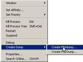 There are a few different ways to manually capture a dump. Since an error message preceded the process before it crashed, iexplore.exe remained running and I could use SysInternals Process Explorer to dump out the process. In XP, this is quickest, most direct way to perform this as no installation or setup is necessary. To do this, launch Process Explorer, find the process you want to dump, right-click and choose Create Dump: