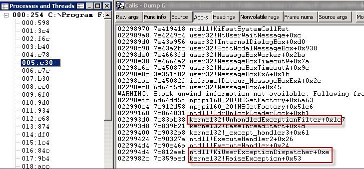 Think of an exception as an error. Well written applications can catch exceptions and proceed normally, handling the error in some manner that is not going to crash the application. On the flipside, think of an UnhandledException as an error that the program has encountered and does not know how to proceed, resulting in a catastrophic failure. Another hint that this is the thread we want to focus on is the presence of the MessageBox function in the user32 module higher in the stack. The call to this function is what relays the error message we see when IE is crashing. You can find the error by looking in one of the parameters of the argument in the frame of user32!MessageBox using the display memory command (d).