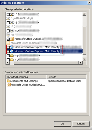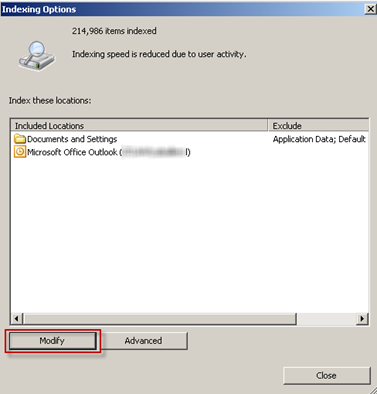 This can be eliminated by uninstalling Windows Search. Alternatively, this can be worked around … to some degree. Windows Search offers an option to disable the indexing of Outlook Express items. To do this, right-click the Windows Search icon in the system tray to change the Indexing Options and then select Modify: