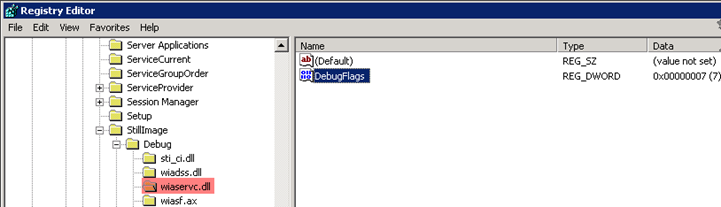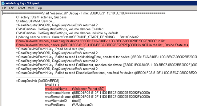In both cases, trace logging was enabled on the WIA service by going into HKEY_LOCAL_MACHINE\System\CurrentControlSet\Control\StillImage\Debug\wiaservc.dll\DebugFlags and setting DebugFlags DWORD value to 7 (the default is 0)*: