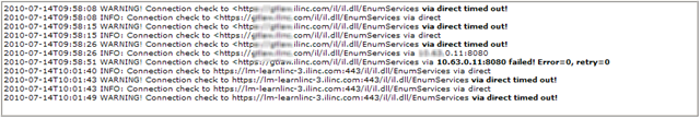 For the most part, setup-install and application logs are usually written to the user’s temp folder, C:\Documents and Settings\username\Local Settings\TEMP, and luckily the application was log enabled and we could read it with Notepad. A quick look revealed the following line throughout: "WARNING! Connection check to https://…/EnumServices via direct timed out!"