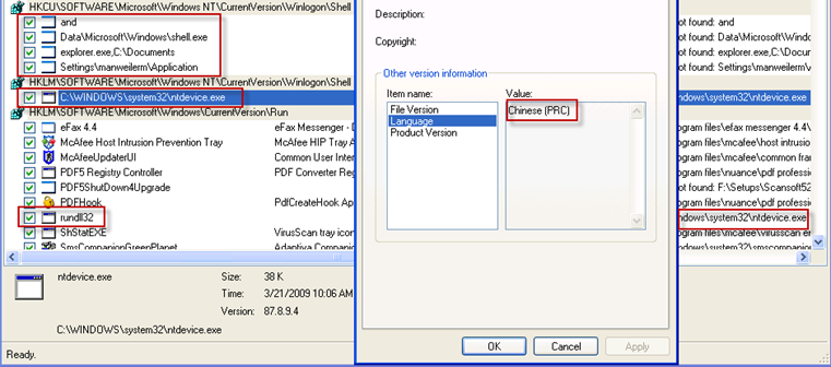 Next I started Autoruns and went through each entry looking for suspicious startup items. Since the malicious exes were already deleted, I expected to find a lot of “File not found.” I would delete these anyways. I was mostly interested in entries that I may have missed; mainly hidden tasks but I could not find any. But looking at the properties of one of startup entries, ntdevice.exe, I can see its its origin is, in fact, Chinese:
