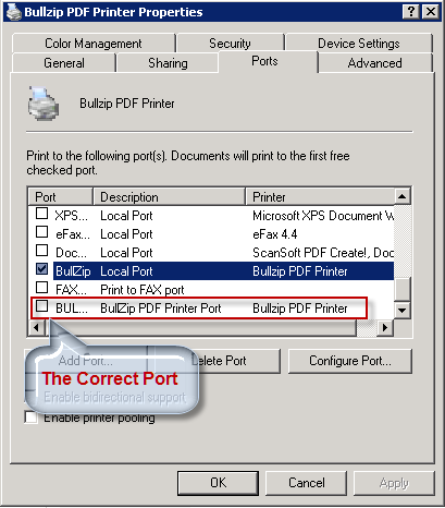 BullZip should not configure itself as a Local Port since it is not a physical print device. Attempting to correct this, I checked the correct port as in the image above. However, after applying the new setting and closing, the problem port reared itself again after opening the properties again to confirm. Furthermore, it was not possible to select this port and delete using the Delete Port button.