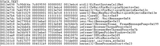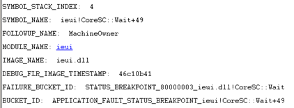 The reliable DrWatson fails to capture the fault error in either log or produce a user-mode dump when IE crashes. We need to manually attach some debugger to Internet Explorer to get a dump … or we can use Process Explorer, since the error prompt precedes ending the iexplore.exe process, which means it can be right-clicked on and dumped from there. I copy and open the dump to my workstation which already has the Windows Debugging Tools installed and open with WinDbg. It points to a “false-positive”, which is just another way of saying that the WinDbg heuristics engine cannot specify the cause: