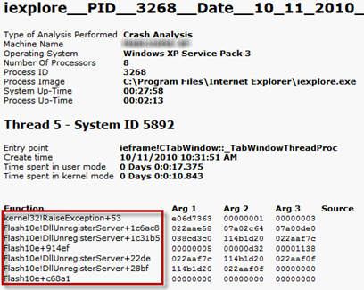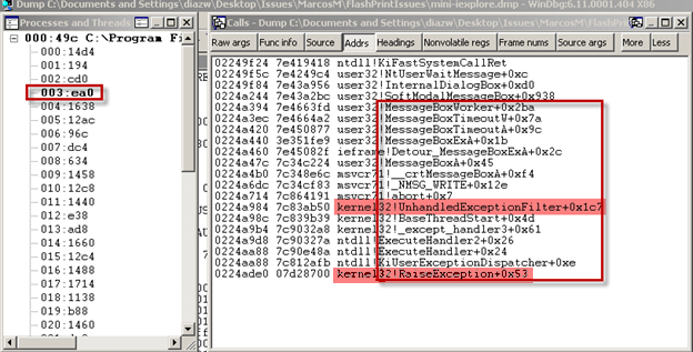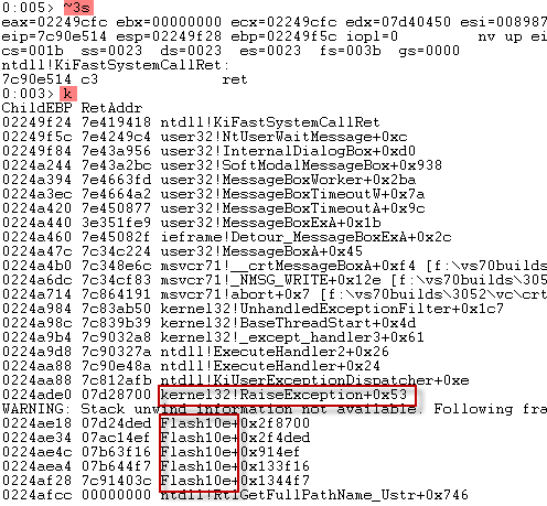 Alternatively, you can see more of the stack by switching to the context of that thread by typing ~3s. Follow with the k command to reveal the Flash component encountered right before the exception: