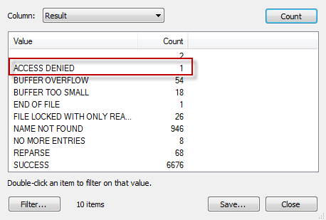 To investigate, I turned to Process Monitor and ran windbg –I from the command shell again, stopping the trace once the Windbg error was encountered. The trace was not filtered since I was not certain which other processes besides regedit were involved, but I knew I was dealing with an Access Denied result somewhere. You can quickly sort occurrences in the trace by going to Tools > Count Occurrences. Filtering for Results there was a single Access Denied on the AeDebug key: