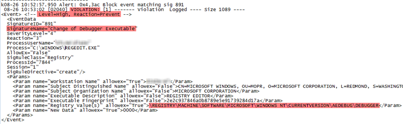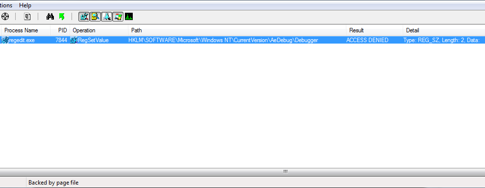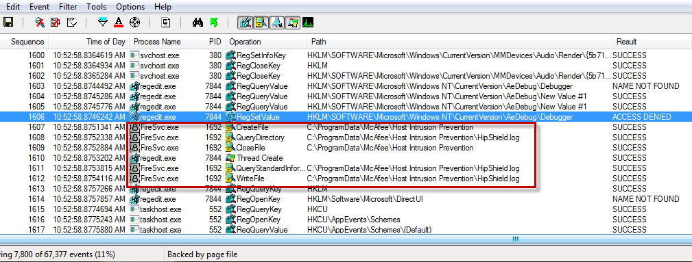 A component of our AV security suite is writing to one of its log files. I right-clicked the operation and selected Jump To, which opens the log file in Notepad. Scrolling to the bottom of the file reveals that this registry operation is being blocked: