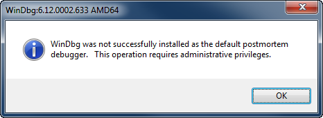 I like to play with post mortem debuggers to help troubleshoot issues with crashing or hanging application by doing some basic analysis of the dump files. Often times I change the Windows debugger between Dr Watson and WinDbg on my Windows Xp workstations. To make Windbg the default debugger you can go into the command shell and run the following command: Windbg –I. After doing this many times previously, I was surprised when I encountered the following error when trying to change the debugger on my Windows 7 workstation. “WinDbg was not successfully installed as the default postmortem debugger. This operaton requires administrative privileges.”