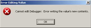 But I was already running from an elevated command prompt. This was odd because a few weeks earlier I had no trouble doing this. Trying the same thing on the Windows XP workstation: “Cannot edit Debugger: Error writing the value’s new contents.”