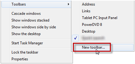 I know Microsoft wants to us to use the Pin this program to taskbar feature but I don’t care for it. I really like the Quick Launch feature. Out of the box, Windows Vista and 7 do not enable the Quick Launch. But you can bring it back with little effort. To do so, right click the Taskbar and select New toolbar.