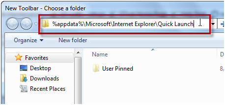 Now paste the following into the toolbar path location: %appdata%\Microsoft\Internet Explorer\Quick Launch.