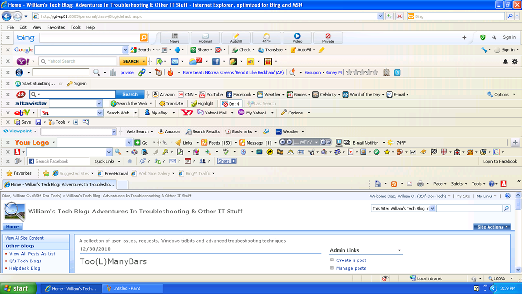 I have run into quite a few IE environments in my time, often cluttered with annoying toolbars. Although I frown upon too many toolbars in any browser, I decided to see how many toolbars I could install in IE before I got tired. To isolate this potentially unstable environment, I started Windows XP mode from my Windows 7 system and after 45 minutes achieved the following: