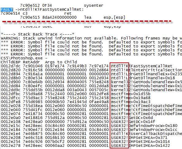 In the case here, we have a user complaining of frequent crashes while working in Adobe Photoshop. This is an XP system so I am hoping that Dr Watson, the default post mortem debugger*, is capturing the crash. I ask for the computer name and UNC to the location where the drwtsn32.log and user.dmp files are written when an exception is caught; this can be found in \Documents and Settings\All Users\Application Data\Microsoft\Dr Watson. Both files are there and have a recent modify date-time, and I copy both of these to my system for analysis.