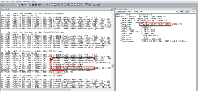 Nothing 3rd party here; these are Microsoft components. I will need to look at the user.dmp with WinDbg from the Windows Debugging Tools and examine other threads in the dump, looking for (literally) an exception. After opening, I dump all the threads with ~*k and start working my way up until I find what I am looking for: