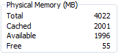 Altogether, half of the system RAM is being used. You can arrive at a round-about number using the following equation: 4022 Total MBs – 1996 Available MBs = 2026 MBs in use, or 4022 * .50 = 2011(yeah, there’s a 15 MB difference and I am not going to try to break that down).