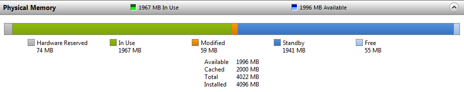 In Use: Memory being used by system and OS resources, like drivers and processes. This metric is arrived at by subtracting the total of Modified, Standby, and Free memory from the recognized RAM, i.e. 4022- (59 + 1941 + 55) = 1967.