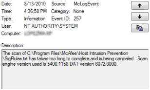 Although we began to focus on the anti-virus initially as a suspect, in hindsight the anti-virus was actually a victim. These events were basically telling us that local system files could not be scanned because the system was too busy, or too backed up, to process any file disk IO. After 90 seconds, the anti-virus would give up and suspend the scan operation of the local files it was scanning in the background and through this event. The obvious point of contention was the hard disk or disk subsystem.