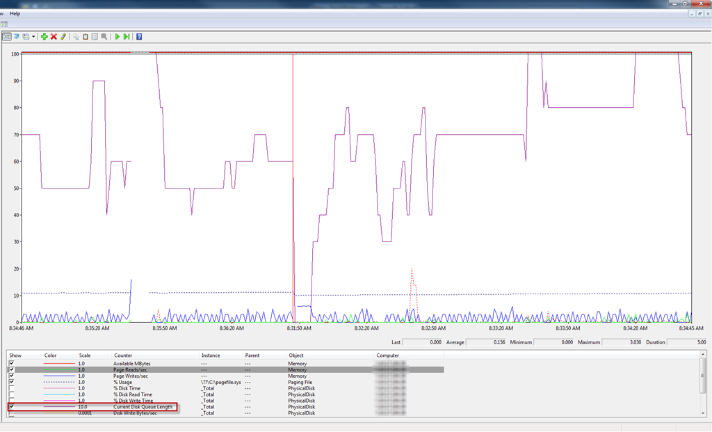 Eventually, I turned to Performance Monitor. The major benefit here was that I could remotely connect perfmon to the problem workstation and monitor various system counters in realtime. A task we could not do on the system itself since it was hung and could not display any performance data. I added a few key counters: CPU usage, Available Memory, and various Disk counters: %Disk Time, %Disk Read Time, %Disk Write time, and Current Disk Queue Length. Below is a sample of these counters when the system would hang.