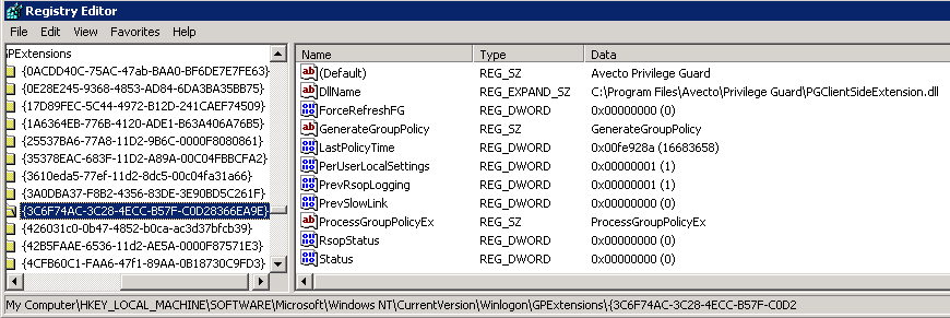 Opening the Task Manager, I do not see the Privilege Guard service running, which was expected since the pilot had since been completed and the service removed. With the client service no longer present (as well as the absence of the server side application as well), the group policy extension in the registry had no valid registration.