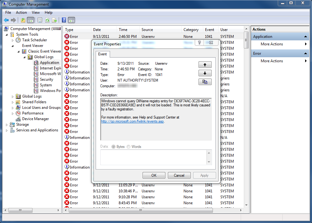 Many errors or warnings you encounter in the Windows event viewer may not really have an impact on the operating system, such as causing performance bottlenecks or application errors. But that doesn’t mean it doesn’t bother me when I encounter rather vague, mundane, or unexplained errors, such as the Userenv event ID 1041 errors encountered here while recently reviewing some newly deployed workstation images at our helpdesk: “Windows cannot query DllName registry entry for {insert guid here} and it will not be loaded. This is most likely caused by a faulty registration.”