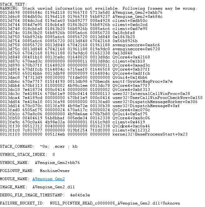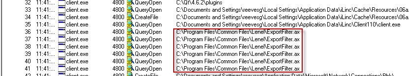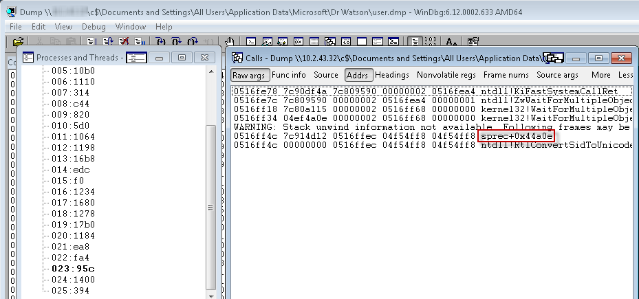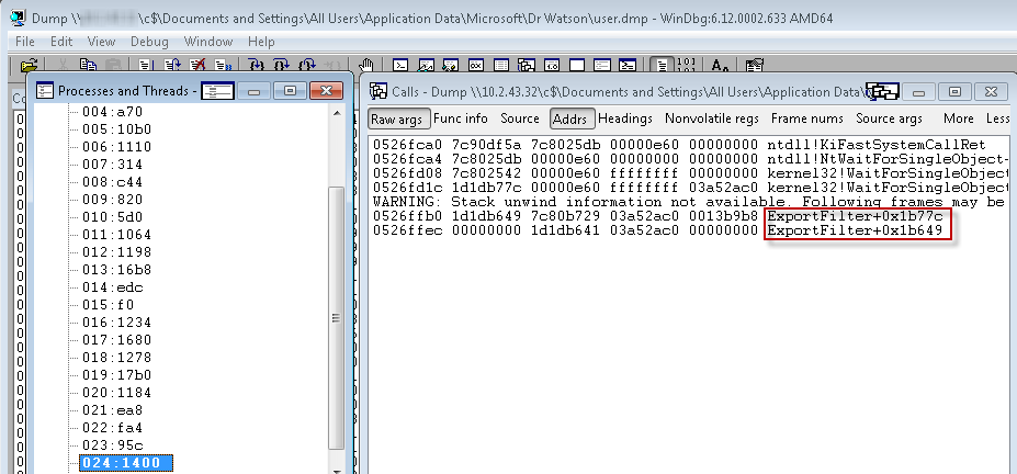 !analyze –v reveals no surprises; there are a few 3rd party modules, all from the crashing iLinc application. I would need to look at earlier threads for clues. This can be accomplished in a GUI friendly type of way by going to the WinDbg View menu and selecting the Processes and Threads and Call Stack options. I arrange them side by side and select each thread, looking for signs of an exception or fault and then looking for the presence of other 3rd party modules. I find a couple interesting components, none that I have seen before on any workstations within the company: