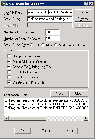 The UI is pretty much self explanatory. By default, log and dump files are written to C:\Documents and Settings\All Users\Application Data\Microsoft\Dr Watson. You can view the log of the current exception from the UI or open the log itself, which is appended to each time Watson captures an exception, with the most current exception text added to the end the log. I am often interested in establishing a pattern or history of application crashes so I prefer to look at the drwtsn32.log as not all application crashes are reproducible and its not uncommon to run across a random, one time exceptions. Opening the log in Notepad also provides the benefit of using the search feature since you are usually looking for a couple key search words to expedite your analysis.