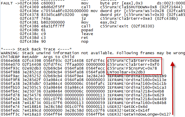 In this case, we have a Windows module, USER32, calling into IEFRAME, which eventually calls into a 3rd party toolbar (LNToolBar) in IE that further calls into another component that is also part of the same application. Disabling the IE toolbar add-on worked around the problem. Ideally, the software developer should be contacted once an issue like this has been identified so they can further examine and possibly correct.