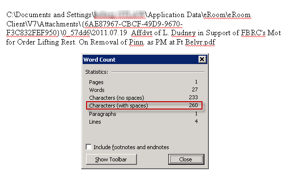 In this case, a folder named 0_57dd6 is created that should contain the cached document, but the document never ends up being written into this folder. To see why, take the path and the document name and do a Word count: