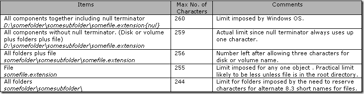 A note about paths: a path cannot exceed 247 characters. <C:\>3+<Path>244 = 247. Why 247? Windows needs to reserve 12 characters for the older 8.3 file naming convention (early Windows and DOS), so long filenames are backwards compatible with legacy file systems, i.e. 247 + 12 = 259.