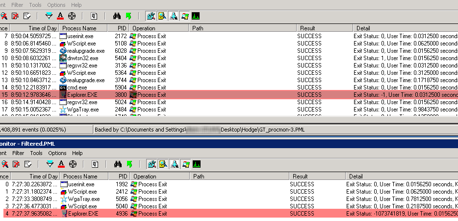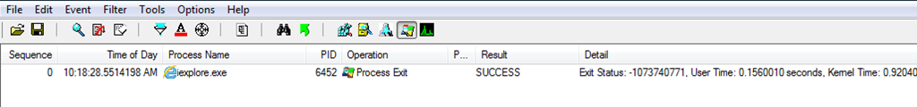 When processes exit, they should exit with a status code that indicates whether or not it exited gracefully or abnormally. This comes in helpful when you need to examine large Process Monitor logs and want to isolate the time of the crash. Simply filter for Process Exit: