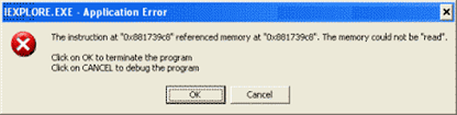 Or in user dumps as: ERROR_CODE: (NTSTATUS) 0xc0000005 – The instruction at 0x%08lx referenced memory at 0x%08lx. The memory could not be %s.