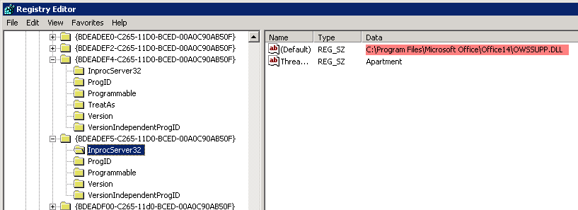 So, where is {BDEADEF5-C265-11D0-00A0C90AB50F} coming from? The answer is on a lab computer that was not having the problem but did, in fact, contain the correctly populated key and sub-keys. And upon examining InProcServer32, I can see it points to a version of OWSSUPP.DLL for an Office 2010 installation (Office14 folder):