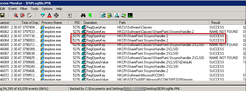 Armed with that, I started up Process Monitor on one of the problem workstations, set a filter for iexplore.exe, opened a SharePoint Calendar, selected the Actions menu, and stopped the trace. Next, I started a search via CTRL+F, using Stssync as as the criteria in the procmon log. I’m ignoring the hits in HKCU and focusing on those in HKCR only:
