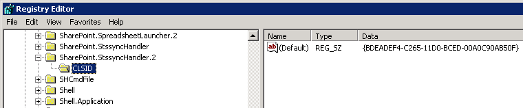 From here, I can right-click one of the operations above and jump to it in the registry automatically from the context menu, which takes me to the SharePoint.StssyncHandler.2 key, where we have a class identifier: