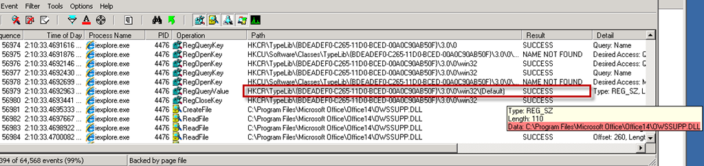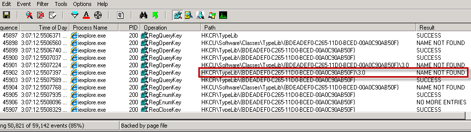 I needed to find the difference between those workstations where the “Connect to Outlook” feature was working and those where it wasn’t. To start, I would need to find the name of the component involved that implemented this feature and then use Process Monitor to capture a trace of Internet Explorer activity when visiting a SharePoint list and opening the Actions menu.