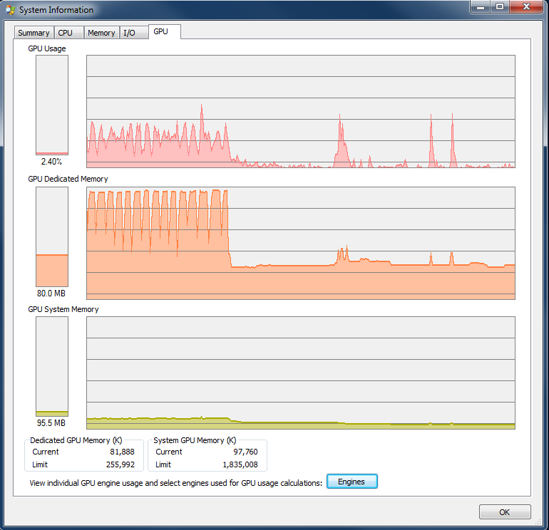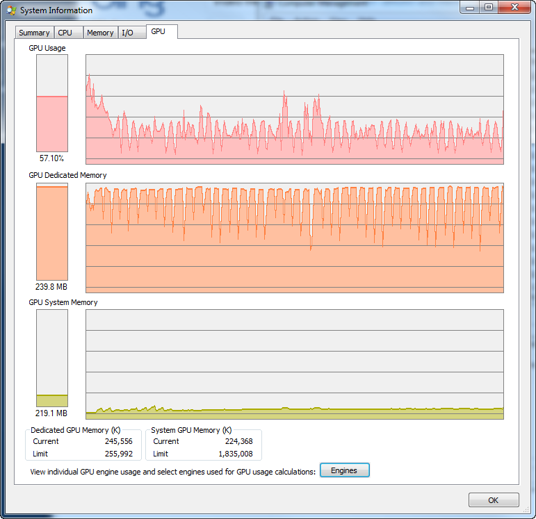 This doesn’t mean that the OS is going come to a halt or applications are going to stop working (well, they might but your not likely to get there). When GPU memory becomes exhausted, it falls back on system RAM. If GPU memory is has already been allocated system RAM because it is “on-board”, then it will just use more system RAM, which is also tracked in the GPU tab under GPU System Memory.