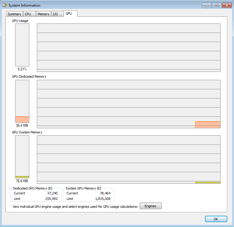 *I suppose this is a matter of semantics. Often, dedicated GPU memory has often meant video card RAM, whereas systems that have on-board video allocate RAM from the system for its own use, often referred to as shared. In the context of Process Explorer and this blog, dedicated GPU memory is any RAM allocated to the graphics sub-system, whether it’s on-board or from a separate video card.