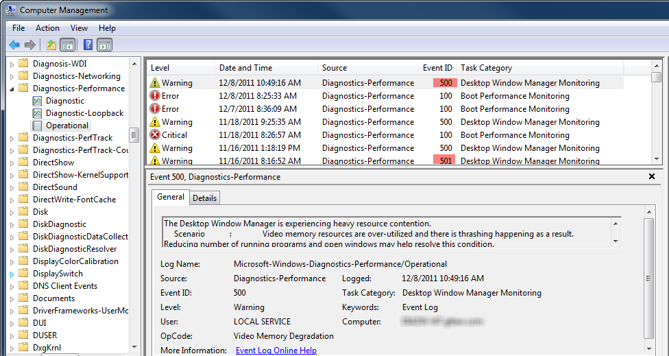 If you had a chance to review the Diagnostics-Performance logs, you may have encountered warning events coming from event ID 500 “The Desktop Window Manager is experiencing heavy resource contention. Video memory resources are over-utilized and there is thrashing happening as a result…” or 501 “…Graphics subsystem resources are over-utilized.”