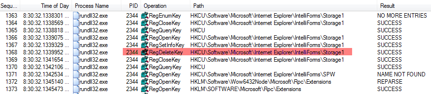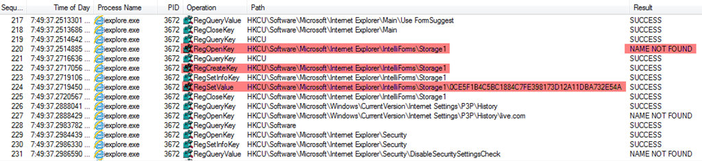 From the trace above, IE starts by attempting to open HKCU\Software\Microsoft\Internet Explorer\IntelliForms\Storage1. Since form data was already deleted previously, this key does not exist any longer, as seen by the result of NAME NOT FOUND. The next step, then, is to create this key. And last, a value is created in the registry for the inputted username.