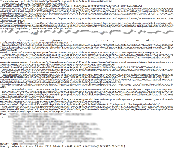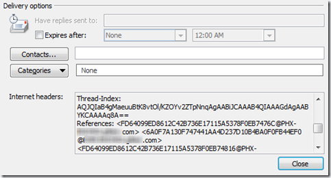 This had nothing to do with a lack of system resources. It also happened across different versions of Outlook (2003 and 2010). The message itself does not contain any out-of-the-ordinary properties at first glance. It is formatted as RTF so there is no hidden formatting that you might otherwise encounter in an html formatted message. Later, a co-worker who was also getting complaints about the same issue, examined the Internet Headers of the message and noted a very large thread-index, one that went on for hundreds of lines, but she wasn’t sure what it meant. The example below is just a portion of the thread-index for the problem message: