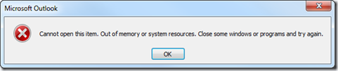 Then upon trying to open the message, the following error was encountered: “Can’t open this item. Out of memory or system resources. Close some windows or programs and try again.”