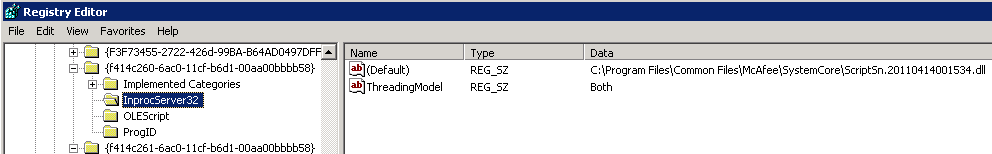 On the problem workstations, InprocServer32 actually points to the path of our AV program folder and a corresponding ScriptSn.datetimecreated.dll: