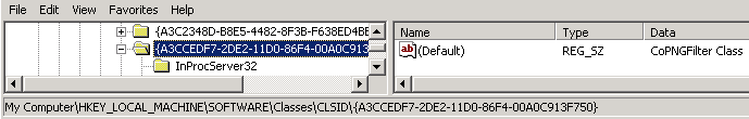 Looking at the default value or InProcServer for this guid tells us it is the CoPNGFilter Class\pngflt.dll, which explains why the IE PNG plugin image decoder component was not working. In fact, visiting any web page with png images, not just the IE logo in About Internet Explorer, would produce a red X: