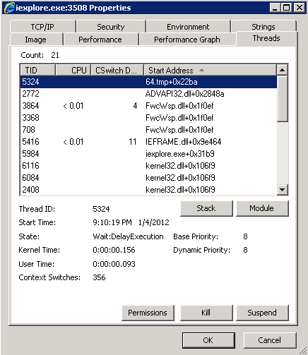 The initial issue I was asked to look at started with Internet Explorer failing to gracefully exit. Instead, it would just hang and required manual intervention via the Task Manager to kill the iexplore.exe process. I connected remotely to the workstation and ran Process Explorer so I could examine IE’s threads for anything out of the ordinary. Sure enough, I saw the presence of a .tmp file: