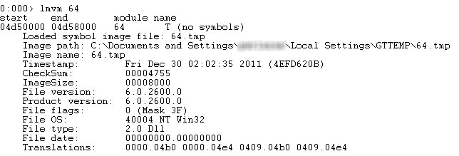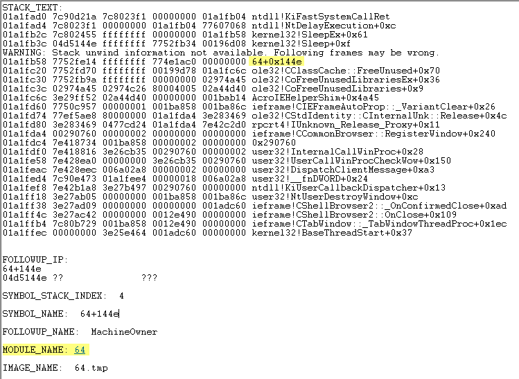 This seems odd, because normally you don’t expect to find temp file trying to execute code in IE (or at least I have never noticed temp files running as threads in IE). Curious, I dump iexplore.exe from Process Explorer by right-clicking it and select Create Dump. I opt for a small dump so I can quickly copy it to my workstation and open it with WinDbg from the Windows Debugging Tools. I run !analyze –v –hang and confirm 64.tmp is the culprit: