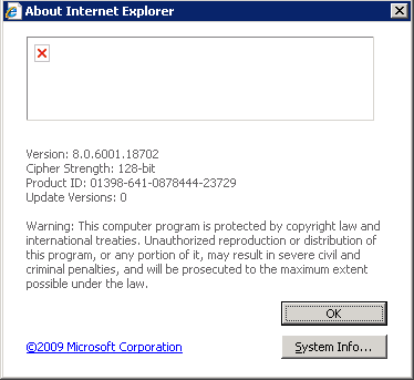 Well, not exactly. When troubleshooting IE problems, I often turn to the About Internet Explorer to verify the version installed, but notice that the IE logo cannot be displayed, instead there is a red X: