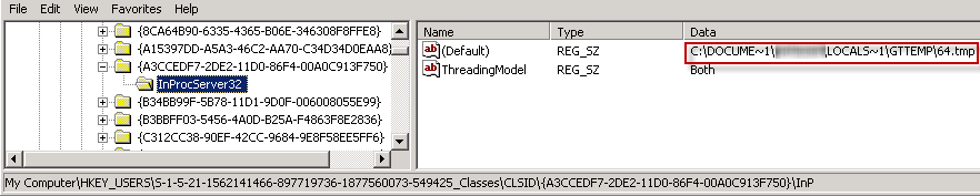 2 Since running into this a few times, I have encountered two cases where HKCR was not modified with a registration pointing to the .tmp files. Only HKU\SID_Classes\CLSID had been modified and curiously HKCU and HKCR were not (and so resolving in those cases involved only deleting {A3CCEDF7-2DE2-11D0-86F4-00A0C913F750} in HKU\SID_Classes\CLSID. This may be because some of the affected users were not administrators on their workstations and the process involved was running in the context of the limited user account (and thus the changes could not be made in HKCR until logoff?).