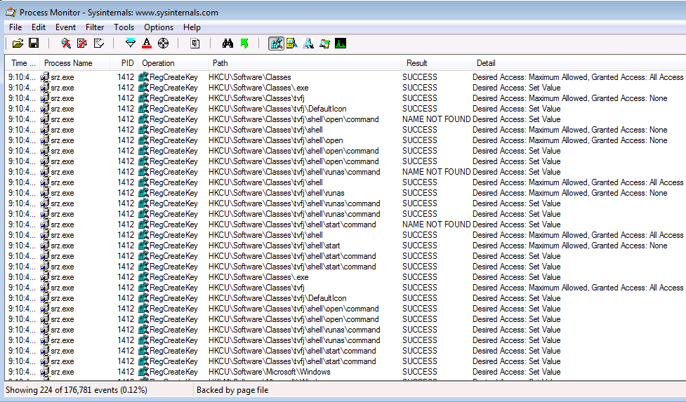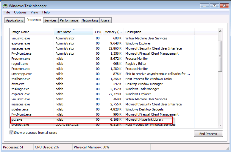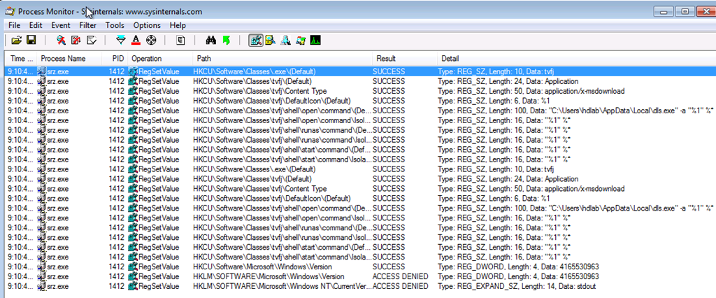 Run as a randomly named three-letter executable (srz.exe in this example). This variant has a description of Microsoft Hyperlink Library (a new random exe will be created from the original if it is run again)