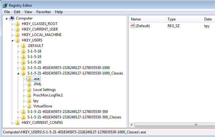 Open the Windows Registry and navigate to HKU\SID_Classes; this is registry profile of the affected user account and you will see more than 1 if there are multiple user accounts**.