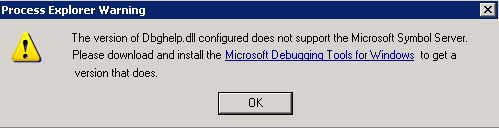 Sometimes when you are troubleshooting with Process Explorer, it’s helpful to be able to view functions in threads to isolate a problem. The same goes for Process Monitor when viewing the Stack tab in the properties of an operation. By default, Process Explorer and Process Monitor will point to the dbghelp.dll in the windows\system32 folder, but this is a stripped down version and doesn’t support symbol server functionality. Instead, you need the dbghelp.dll from the Windows Debugging Tools to properly resolve symbols, otherwise you will encounter the Process Explorer Warning box when you click the Threads tab in process properties: